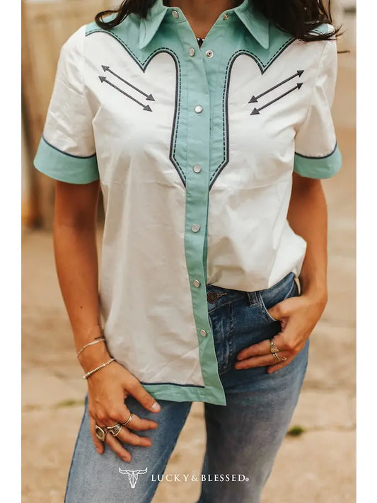 White W/Blue Cowgirl Pearl Snap Button Up SS By L&B