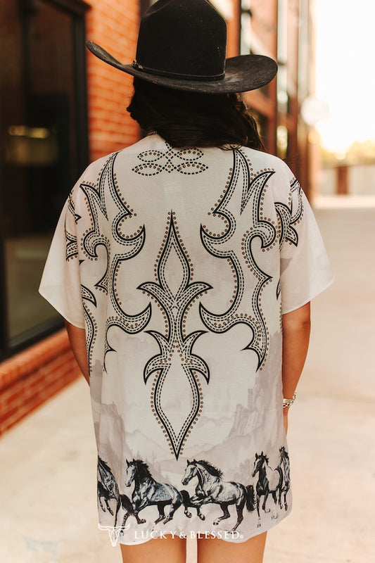 Ivory Horse Boot-stitch Printed Kimono By L&B