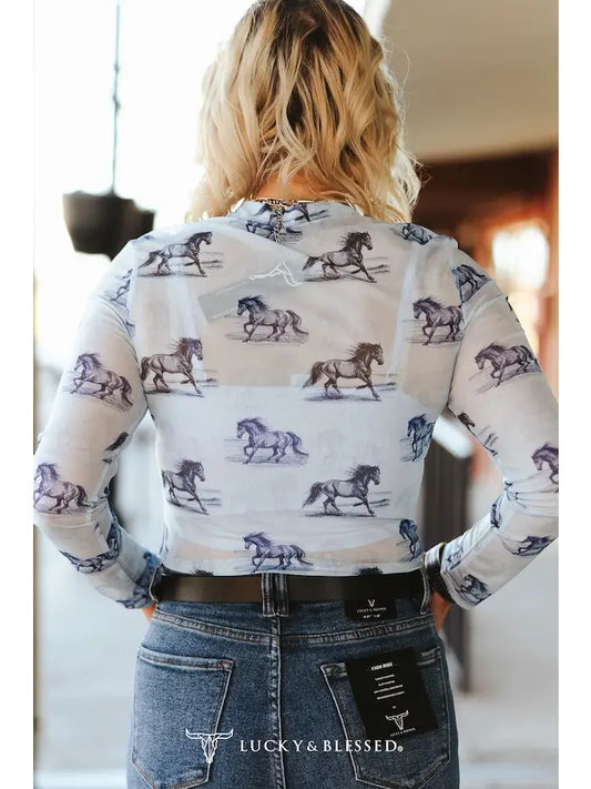 Light Blue Western Horse Print L/S Mesh Top By L&B