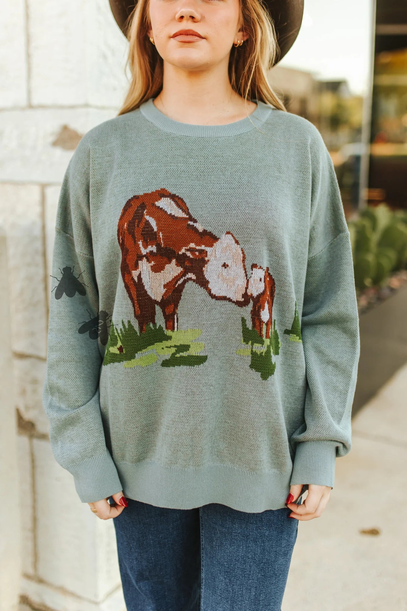 the dusty blue body of this knit is ON POINT.... like the color is goood. & we couldn't resist adding a cow calf pair graphic.