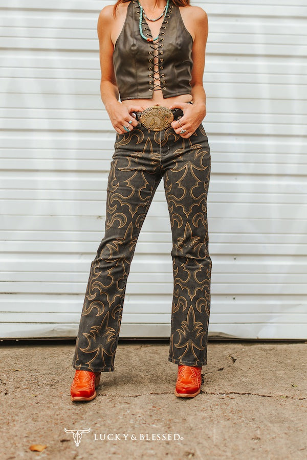 Elevate your western wholesale collection with these statement-making embroidered pants from Lucky & Blessed. Crafted in a deep charcoal wash denim, this high-rise silhouette is adorned with oversized vintage boot stitch embroidery in warm golden tones. The striking all-over pattern nods to classic Western boot craftsmanship, giving the jeans a bold, iconic cowgirl appeal. Featuring a flattering slim-straight leg cut and traditional five-pocket