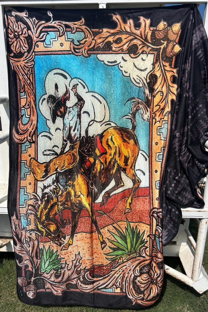 Wrap yourself in the rugged charm of the Roughstart Blanket, featuring vibrant Aztec patterns on one side and a striking bucking horse framed by expertly tooled leather on the other. This versatile blanket blends bold Western spirit with cultural artistry, making it perfect for cozy nights or stylish decor. Durable and visually captivating, it offers both warmth and a statement piece that celebrates tradition and adventure.