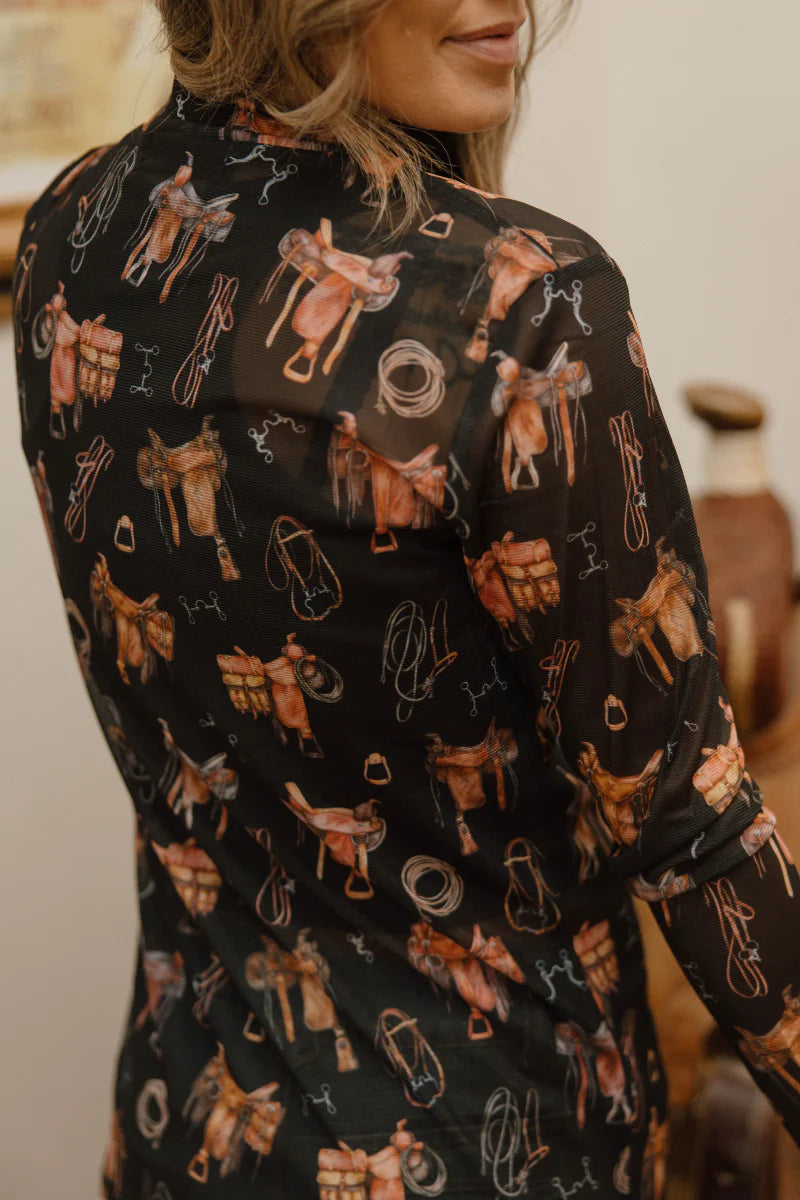 Elevate your style with the Saddle Room Mesh Top, featuring a striking black mesh design adorned with detailed saddles, ropes, headstalls, bits, and stirrups. This unique top combines edgy mesh comfort with a bold equestrian-inspired print, making it perfect for layering or standing out on its own. Embrace a look that’s both daring and distinctive while enjoying breathable fabric that keeps you comfortable all day. Make a statement that bridges fashion and your love for the saddle room lifestyle.