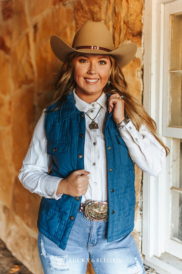 Elevate your fall and winter wholesale offerings with our Western Quilted Snap Button Vest, a timeless piece designed for the modern cowgirl. This sleeveless vest features a rugged-yet-feminine design with structured quilted paneling for warmth without the bulk. The snap-front closure with silver-tone buttons brings a touch of Western grit, while dual flap chest pockets and a collared neckline add both utility and style.