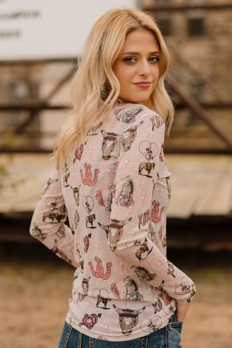 Show your rodeo passion with the XOXO Rodeo Mesh Top, designed to captivate with its romantic Valentine’s theme. Featuring delicate horse shoes, heartfelt “XOXO” details, and an inspiring image of a girl creating a heart with her horse through rope tricks, this mesh top combines style and sentiment. Lightweight and eye-catching, it’s the perfect choice to express your love for horses and turn heads this Valentine’s Day. Don’t miss out on adding this unique piece to your wardrobe.